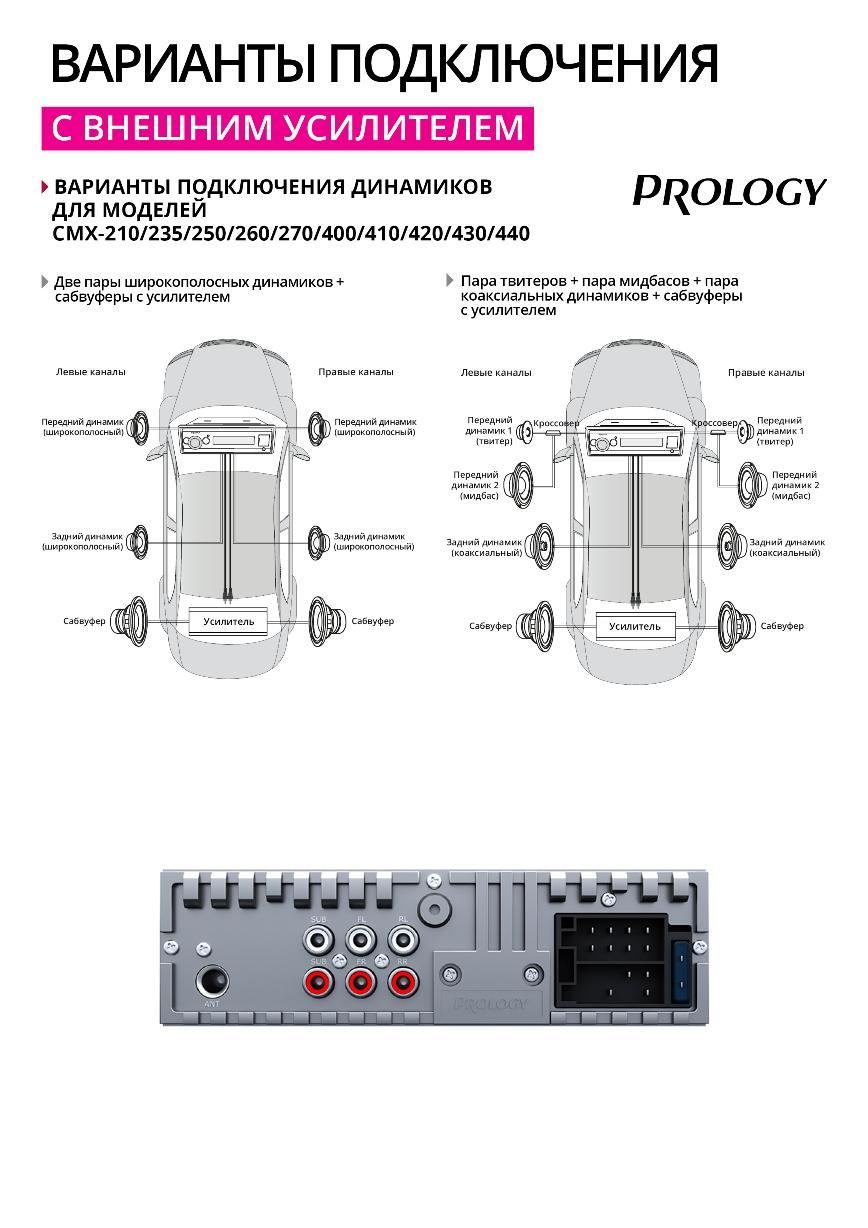 Автомагнитола PROLOGY CMX-420 предоставляет широкие возможности для построения в автомобиле развитой аудиосистемы. Для подключения дополнительных внешних усилителей предусмотрен 4-канальный линейный аудиовыход RCA, а также 2 выхода RCA для подключения сабвуфера.