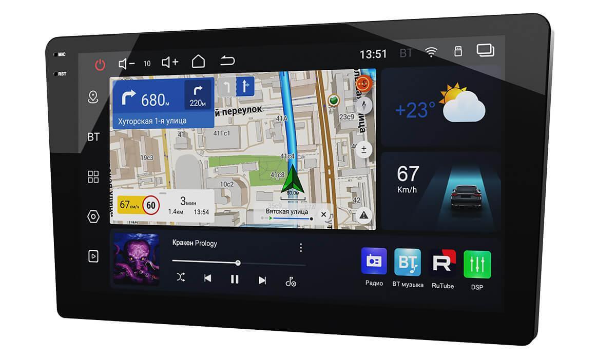 Красивое графическое меню на широкоформатном сенсорном 9-дюймовом (228 мм) In-Cell QLED-экране повышенной контрастности высокого разрешения 1280x720 точек, красочный многостраничный интерфейс управления с большим выбором функций и Android-приложений. Качественное звучание со встроенным усилителем с максимальной выходной мощностью 4x55 Вт.